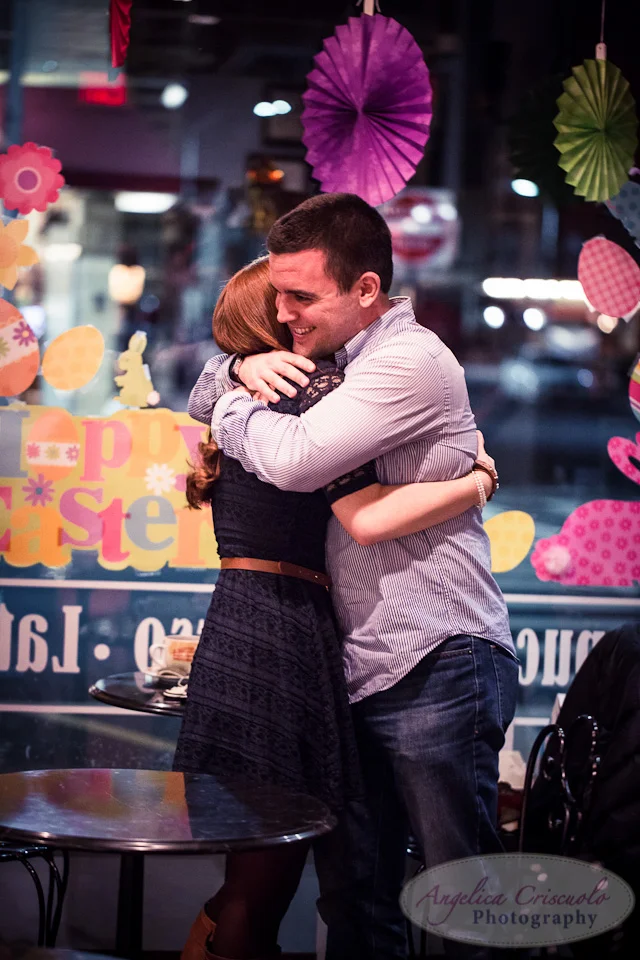 The PLAN: Bring Gina around 7:30pm to have dessert. Have photographer act as a patron just spending time at the bakery with hubby enjoying our own dessert and tea! Rob made sure to sit by the window, best seat in the house, for photographer to get a great view of the two of them. Once Rob and Gina are seated, he'll give her a photo album that Sandy, Gina's wonderful mom, helped Rob put together. After going through the album, Brian from Bovella's Pastry Shoppe will bring out a large tray of cookies with a small ceramic case that looks like an Oreo on top! MMMM....Oreos! Gina will open the box, find the ring, and Rob will say those wonderful words a woman in-love is waiting to hear. As you can see, everything went according to plan! Rob pulled it all off and Gina's beautiful, tearful, happy face was captured in photos. After the proposal, their families who were waiting a block away at a nearby bar came by with champagne to celebrate Rob and Gina's new journey together!