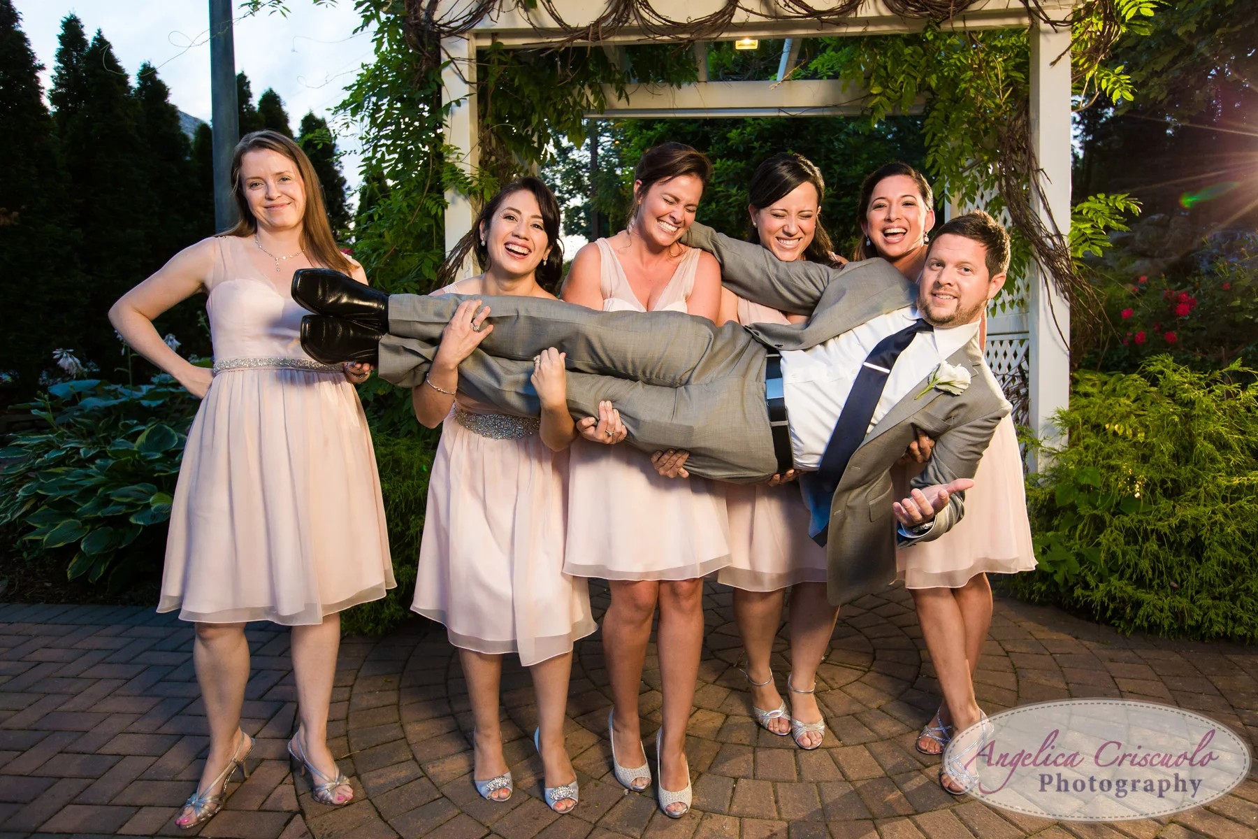 Bride and groom wedding photo ideas New York Groom carried by bridesmaids